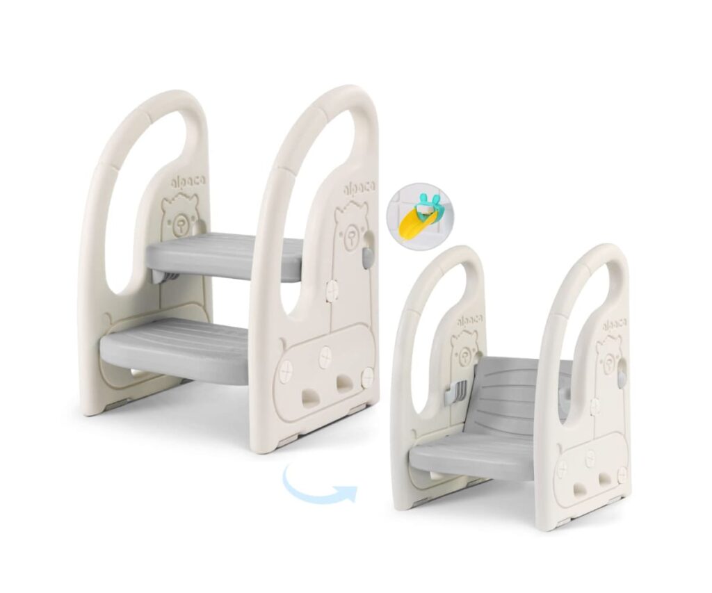 This versatile stool transforms from a 2-step ladder to a 1-step or toddler chair, supporting children’s independence in the bathroom, kitchen, or bedroom.